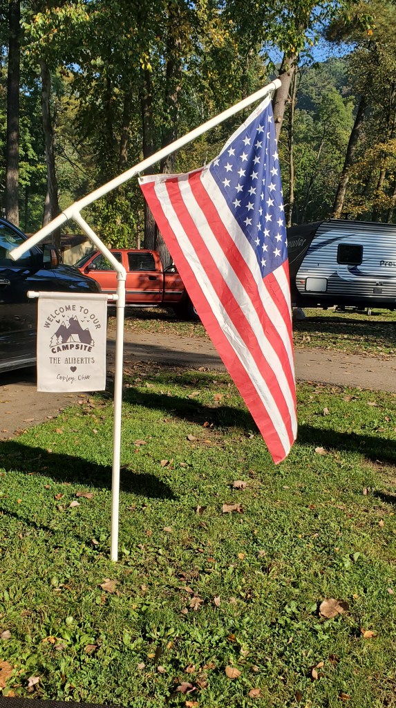 GREAT BUY! I saw this flagpole on our recent camping tour of five (5) states. I immediately knew we must purchase one! I love that we can show how much we love our country at home and on the road! The flagpole accommodates a 3’x5′ American flag that can’t be missed at the campground!